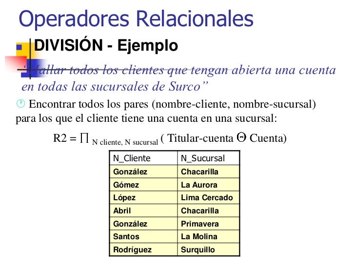 Ejemplo de reunión natural 2. Unión intersección diferencia y producto que vienen de la teoría de conjuntos de la matemática selección proyección reunión y división que son las que se aplican específicamente al modelo de datos relacional y asignación operación estándar de los lenguajes de computación. Las tuplas solución deben estar relacionadas con todos los valores de S pero NO se exige que lo este solo con esos valores.